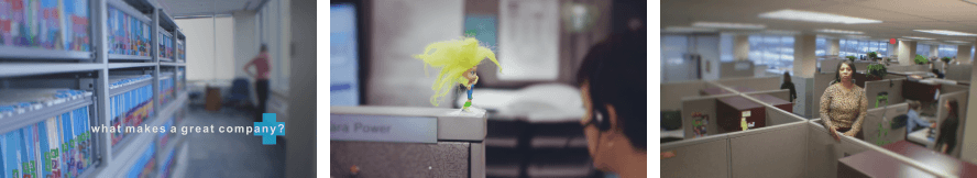 The time -frame required extreme organization, intensive focus, and in the post-process, long hours. The cubicle farm was a challenge: so shots focus on people and on the extremely close. We show the humanity within the constraints of the office environment by showing the personality employees inject into their cubicles. Plus we highlighted various office-social activities (charity events, softball leagues, etc.)